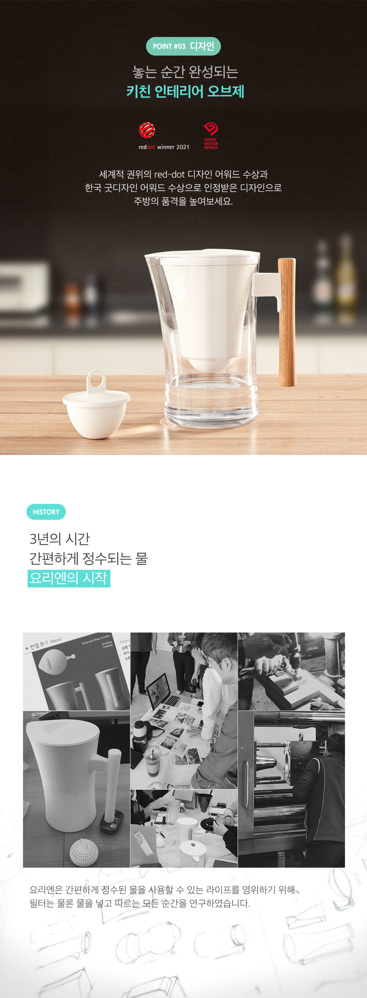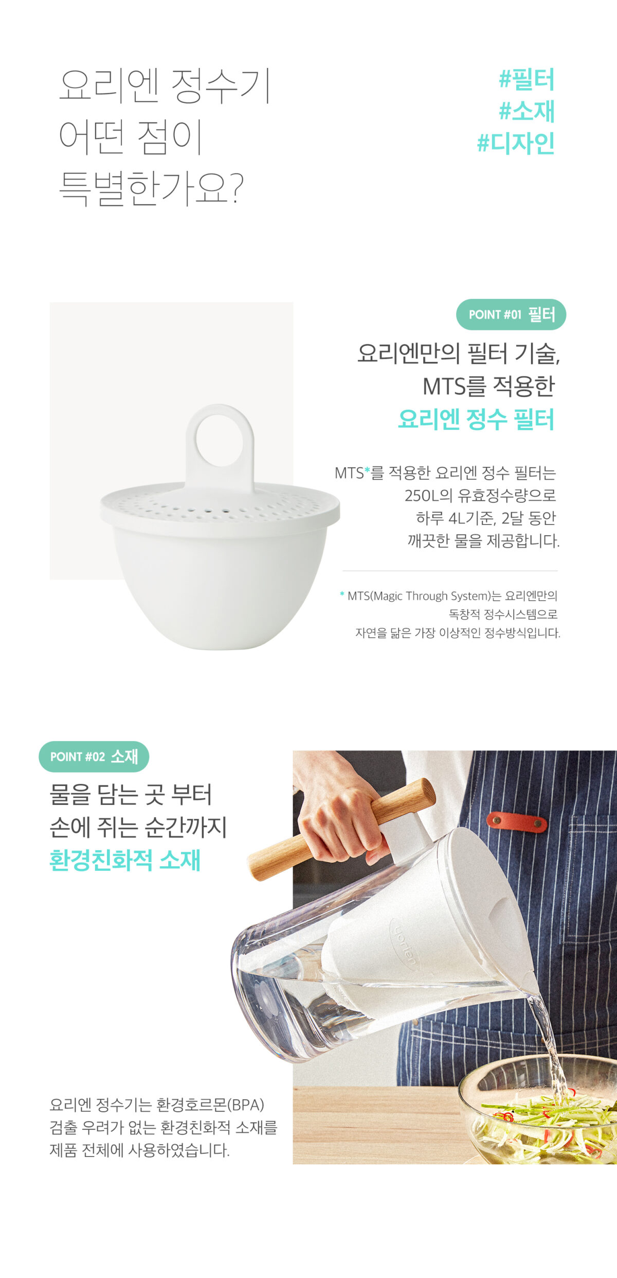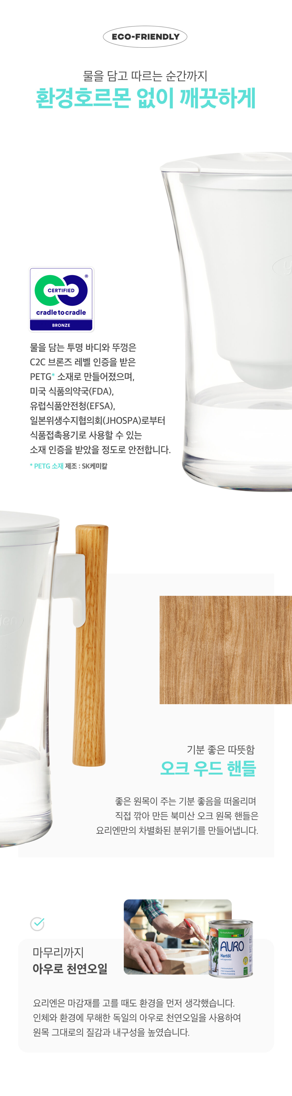 | 주요재질 | PETG(물통, 뚜껑), PP(필터 케이스, 정수 필터, 손잡이 연결부), 손잡이(오크 우드) |