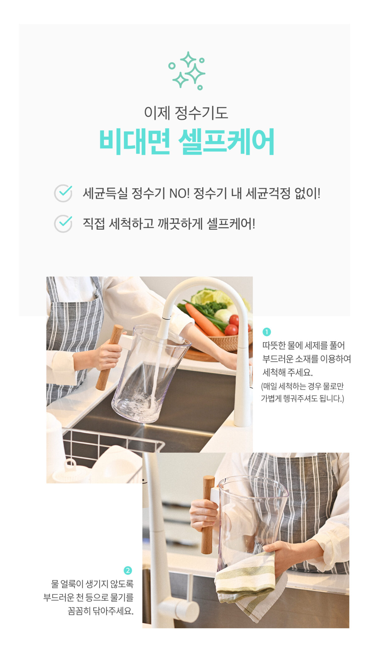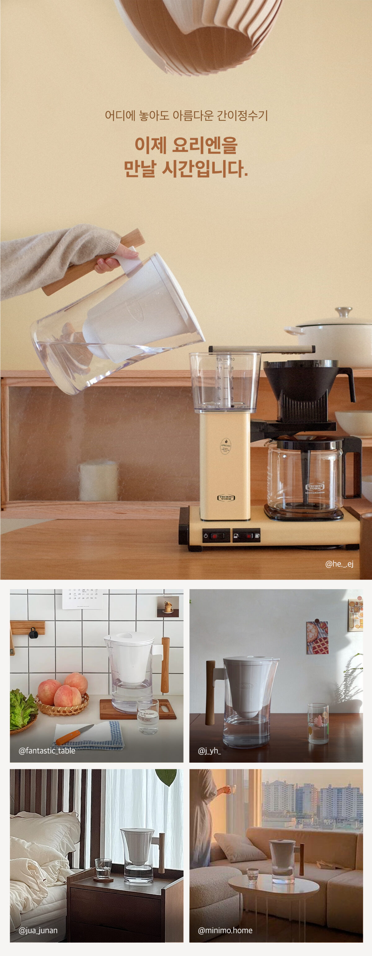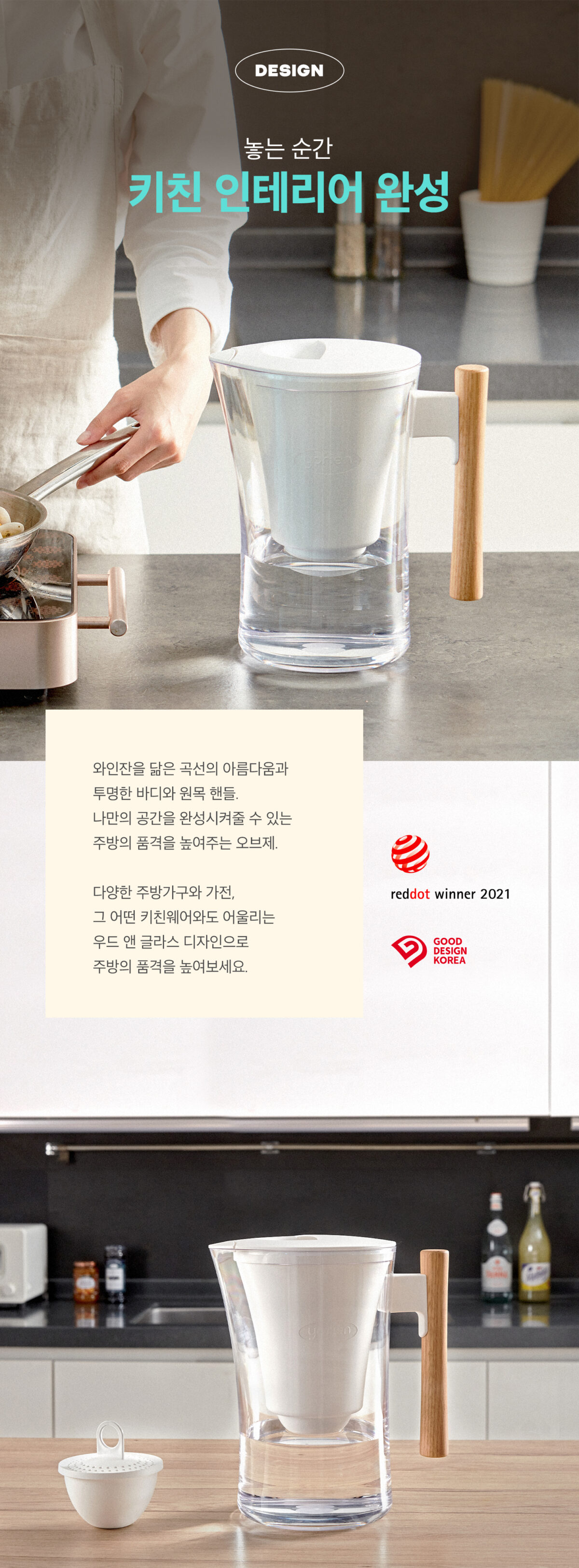기존 간이정수기 브랜드에 비해 예쁜 디자인에 가장 먼저 눈이 갔어요, 집이 화이트 & 우드톤인데 인테리어와 딱 맞았거든요.