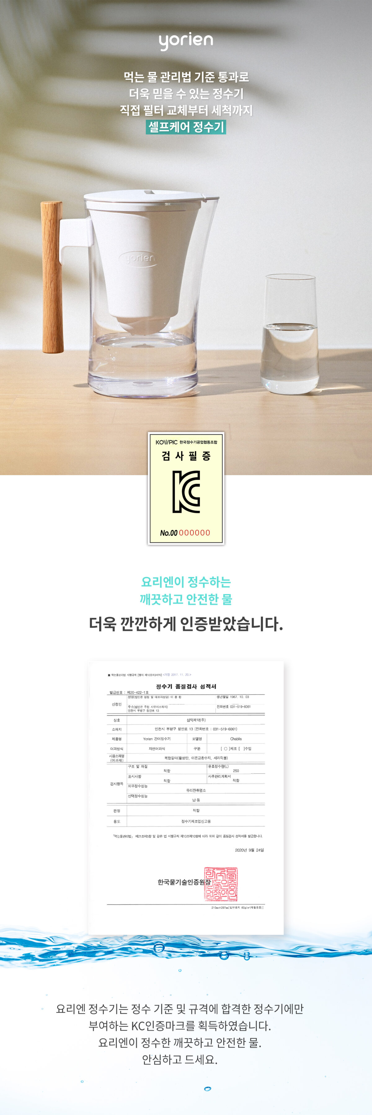 | 제품인증 | KC인증(정수기 기준 및 규격에 합격한 정수기에만 부여하는 품질인증마크) |